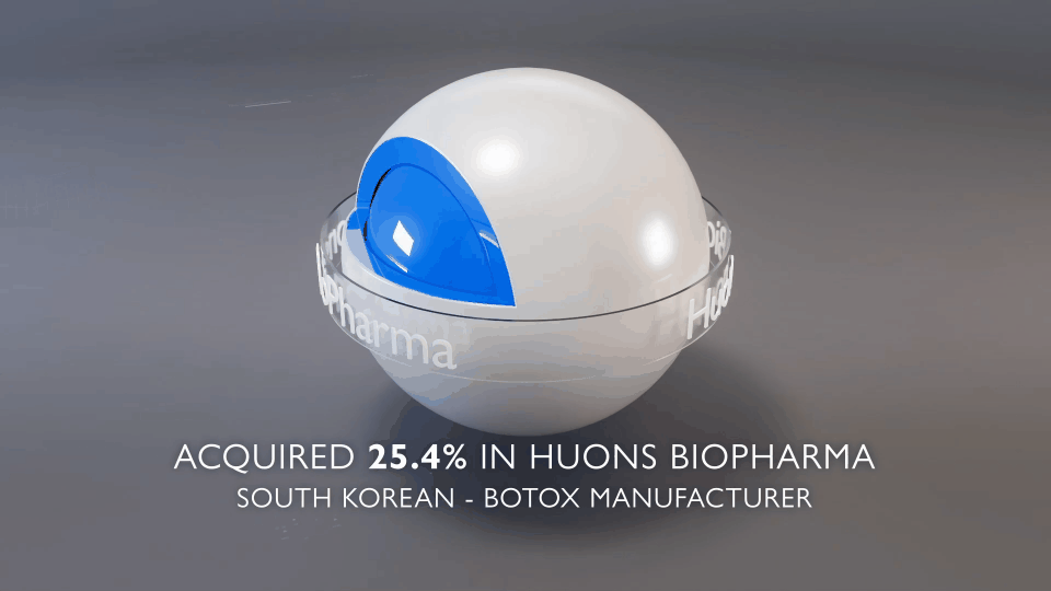 Acquired 25.4% equity in Huons BioPharma (South Korea), consolidating the exclusive distribution rights for Hutox® botulinum toxin type A in China.